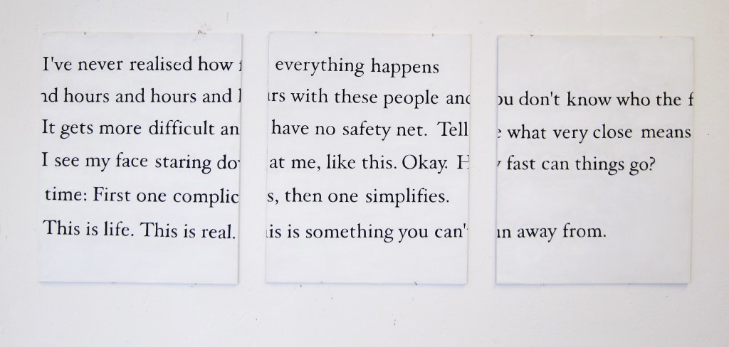 beginning is always missing but I never seem to escape the end (2013) Acrylics on canvas, 40×80 cmdon’t quote me on it (2013) Acrylics on board, 50×130 cmthe world; however it’s none of my business (2013) Acrylics on canvas, 50×50 cm